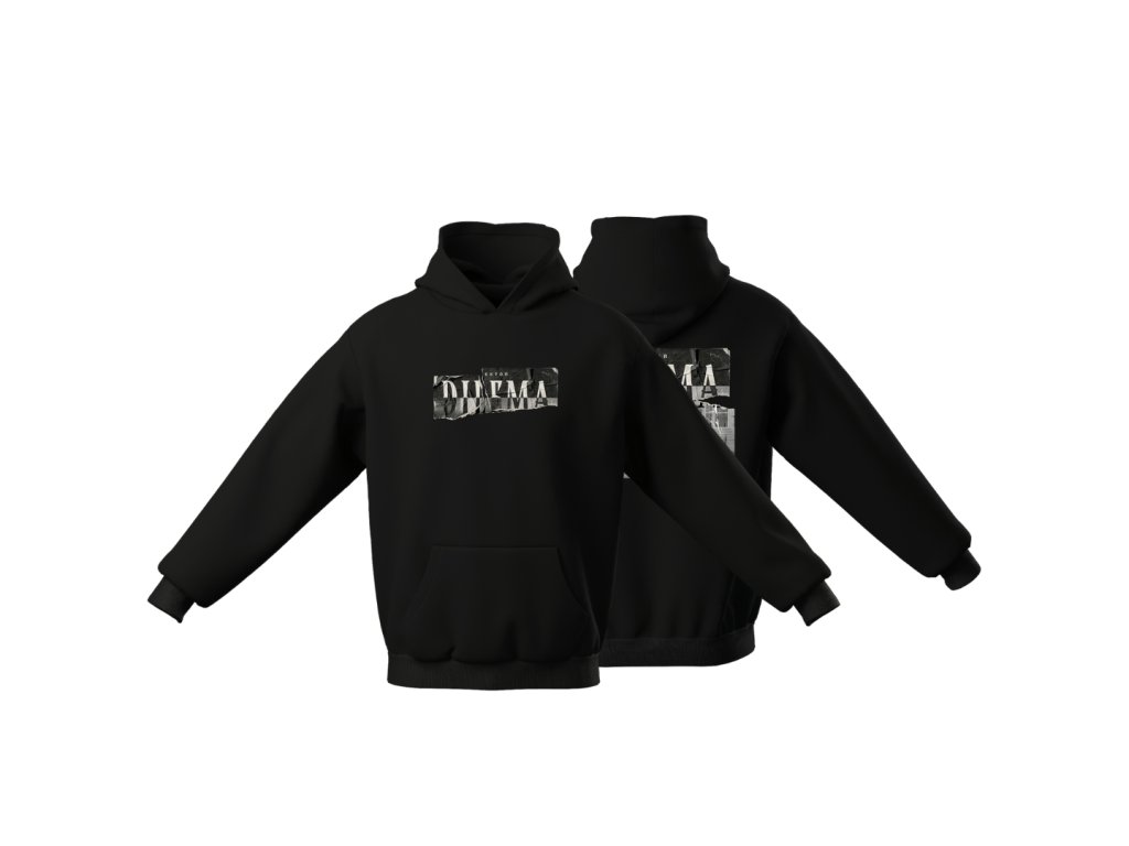 Černá mikina s nápisem DILEMA a fotkou na zádech.