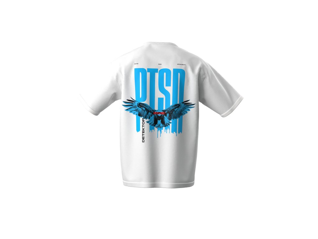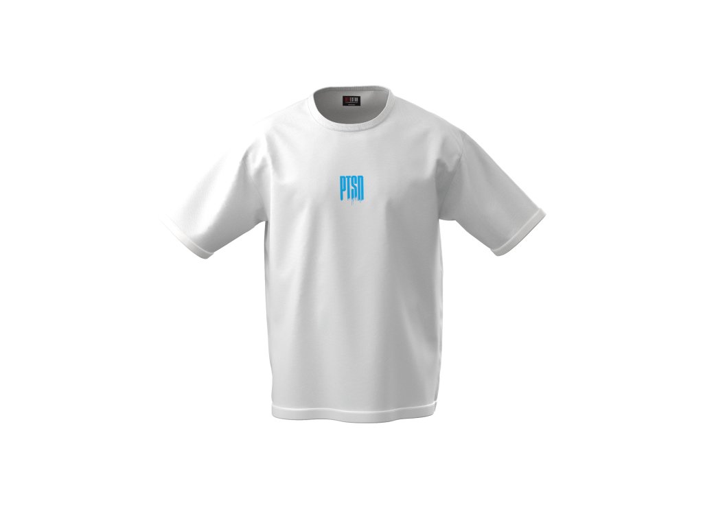 Bílý triko s modrým nápisem PTSD na zádech i na prsou.
