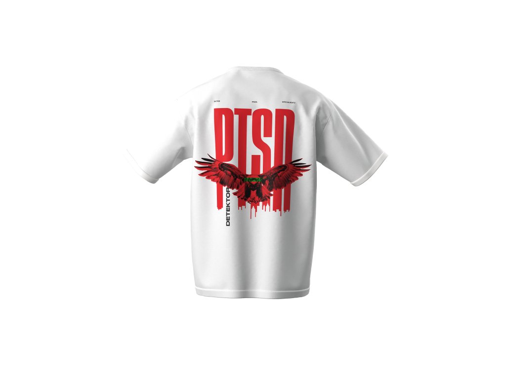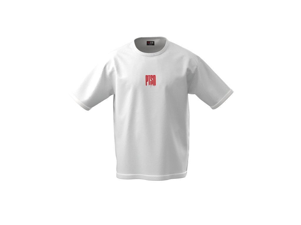 Bílý triko s červeným nápisem PTSD na zádech i na prsou.